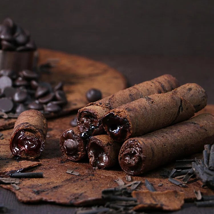 Taste bittersweet and mellow flavors in each bite. The richness of the dark chocolate filling is complemented by the delicate egg roll outer crust.